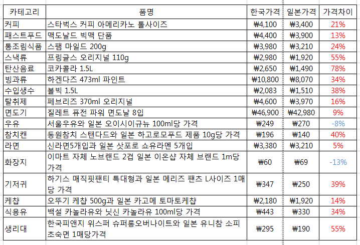 표에서 확인 가능한 것처럼 한일 양국에서 판매되는 외국산 제품의 경우를 비교하면 대부분 일본이 한국보다 2~30% 저렴하다. 심지어 코카콜라와 프링글스 감자칩의 경우는 50% 이상 차이 난다. 한국에서 코카콜라 500mL를 사는 가격(1630원)으로 일본에선 그 3배인 1.5L를 사고도 돈이 남는다(1490원). 스팸, 하겐다즈, 볼빅 같은 식료품은 말할 것도 없고 여성 필수품이라고 할 수 있는 생리대도 한국이 50%가량 비싸다.