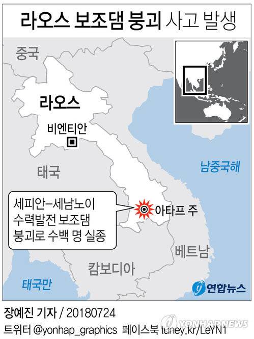![SK건설 참여 라오스 댐 붕괴…대피하는 주민들 (서울=연합뉴스) SK건설이 라오스에서 시공 중인 대형 수력발전댐의 보조댐이 붕괴해 주민 다수가 숨지고 수백 명이 실종하는 사고가 발생했다. 24일 라오스통신(KPL)에 따르면 전날 오후 8시께(현지시간) 라오스 남동부 아타프 주에 있는 세피안-세남노이 수력발전댐의 보조댐이 무너져 인근 6개 마을로 50억 ㎥의 물이 아래 6개 마을로 한꺼번에 쏟아졌다. 피해 지역 라오스 주민들이 보트로 긴급히 대피하고 있다. [라오스통신 제공] photo@yna.co.kr](https://img1.daumcdn.net/thumb/R658x0.q70/?fname=https://t1.daumcdn.net/news/201807/24/yonhap/20180724183630535fgvi.jpg)