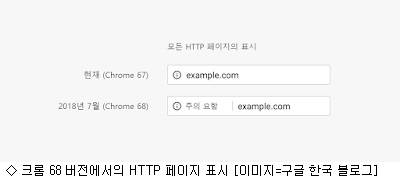 이전 버전(크롬 67)에서는 주소창 옆에 아이콘(ⓘ)을 띄워 주의를 요하도록 했지만, 24일부터는 문구를 병기해 더욱 강력하게 경고하고 나선 것. 이는 국내 시간으로는 25일부터 적용됐다.