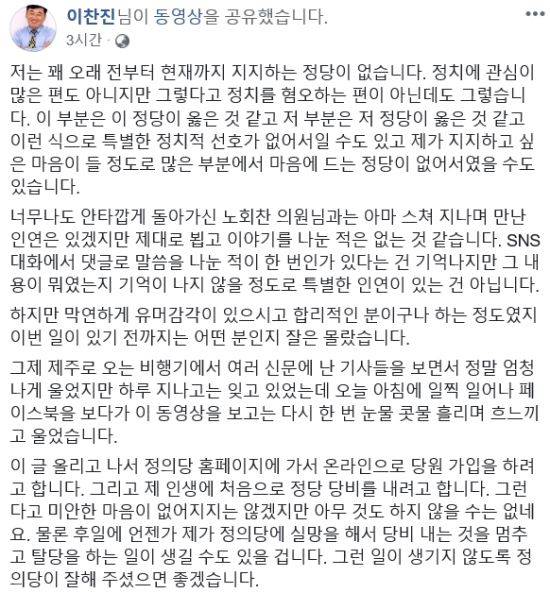 배우 김희애씨의 남편인 이찬진 포티스 대표가 고 노회찬 정의당 의원을 추모하며 정의당에 가입하겠다는 의사를 밝혔다.