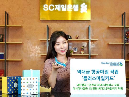 26일 신용카드업계에 따르면 SC제일은행 플러스마일카드(사진)가 항공사 마일리지의 높은 적립률로 인기 몰이가 한창이다.