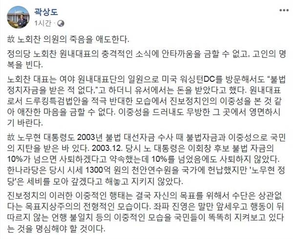 "이중성을 드러내도 무방한 그 곳에서 영면하시기 바란다"고 했다. 곽상도 자유한국당 의원(대구 중구남구)이 "고 노회찬 의원의 죽음을 애도한다"면서 지난 24일 페이스북에 남긴 글이었다.