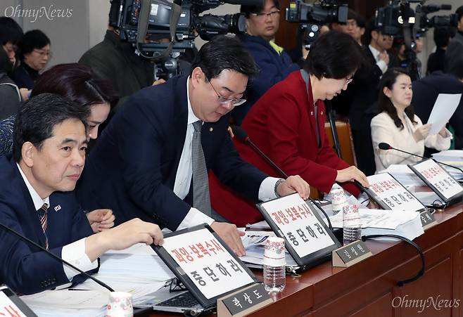 | ▲ 지난 2월 21일, 자유한국당 곽상도(사진 맨 왼쪽), 김성원, 김승희 의원 등이 청와대 업무보고가 예정된 국회 운영위원회 전체회의에서 '과잉·보복수사 중단하라'고 적은 피켓을 노트북에 붙이고 있다. |