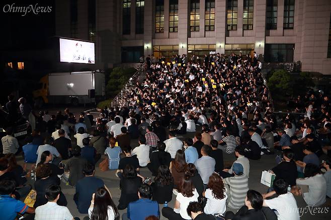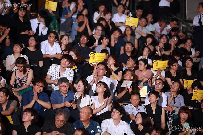 | ▲ 26일 오후 서울 서대문구 연세대 대강당에서 '고 노회찬 국회의원 추도식'이 열리는 가운데, 1,600석 규모의 대강당이 가득 차 들어가지 못한 시민들이 대강당앞에서 대형스크린을 통해 중계를 보며 추도식에 참석하고 있다. |