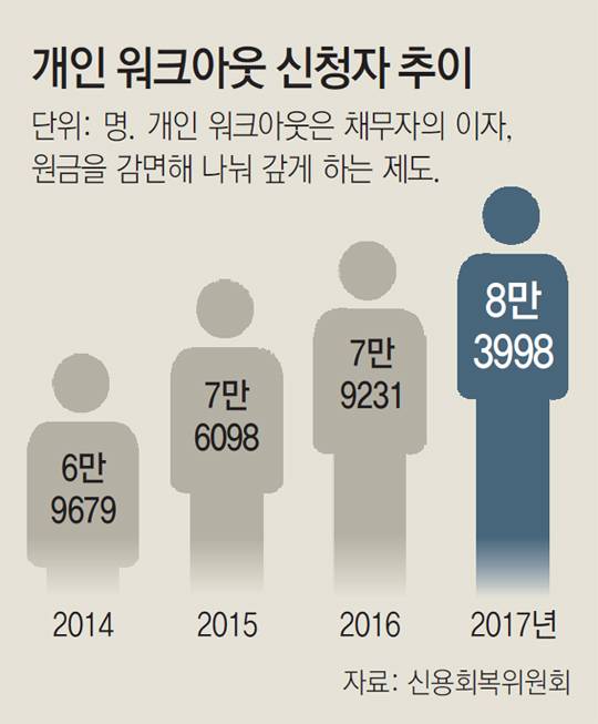 특히 최근 금리 인상과 경기 침체, 취업난 등이 맞물리면서 수입이 일정치 않은 취약계층부터 파산에 빠질 가능성이 높다. 신용회복위 관계자는 “상담자 중 일용직 노동자나 임시직 근로자가 80% 정도”라며 “이들은 카드론과 다른 신용대출을 끌어다 쓴 뒤 동시다발적으로 연체에 빠진다”고 설명했다. 신복위에 따르면 개인워크아웃 신청자는 2013년 6만9679명에서 지난해 8만3998명으로 늘었다.