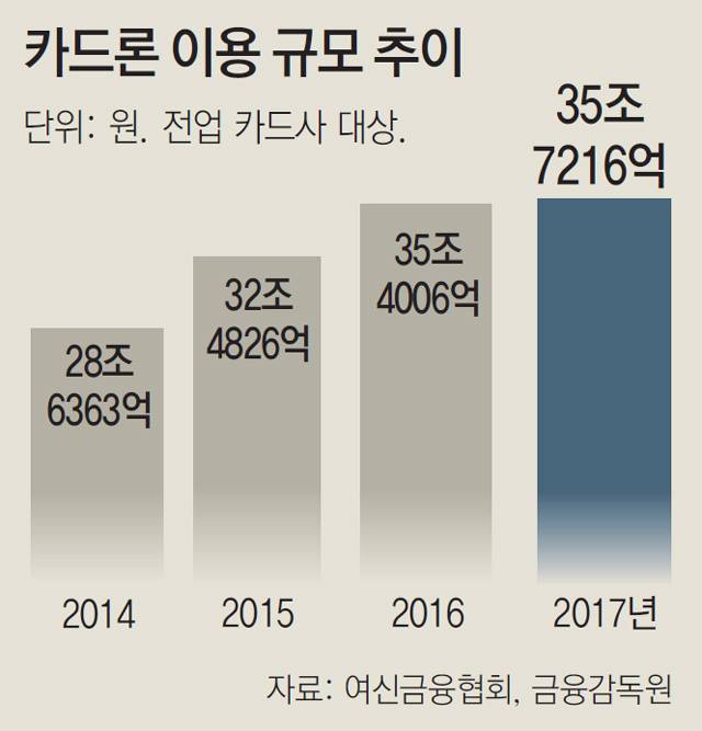 카드사들이 최근 적극적인 대출 영업에 나선 것도 카드론 증가의 원인으로 꼽힌다. 이명식 상명대 교수(신용카드학회장)는 “최근 정부가 영세 자영업자들을 위해 카드 수수료를 낮추겠다며 시장에 개입하니 카드사로서는 신용판매 대신에 대출 영업에 뛰어들고 있다”고 분석했다.