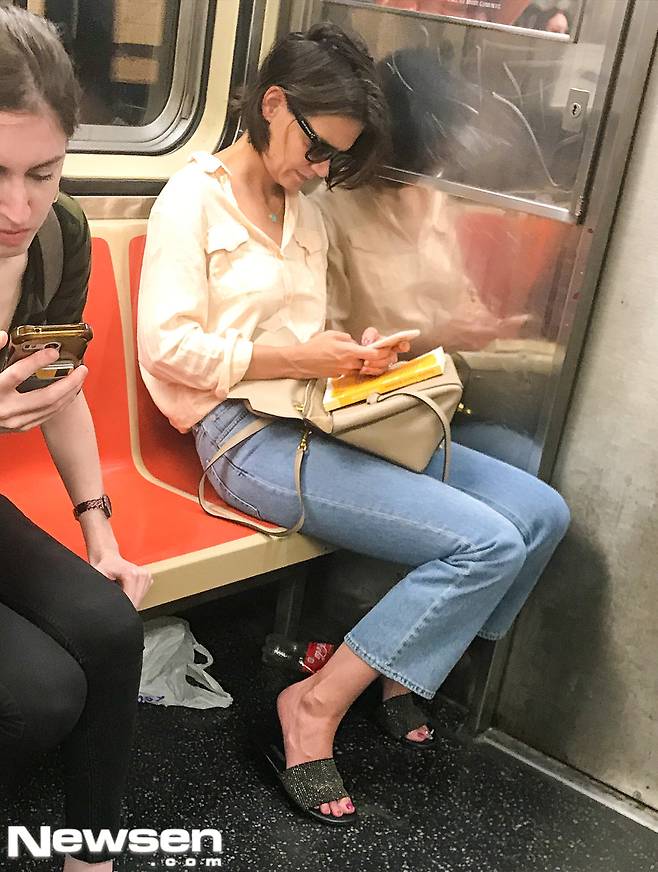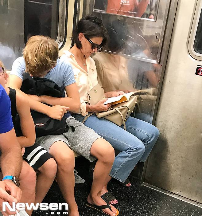 케이티 홈즈는 지하철 구석 자리에 앉아 독서에 몰두하고 있다. 셔츠와 청바지 등 주위를 의식하지 않은 편안한 스타일링에도 시선을 끈다.
