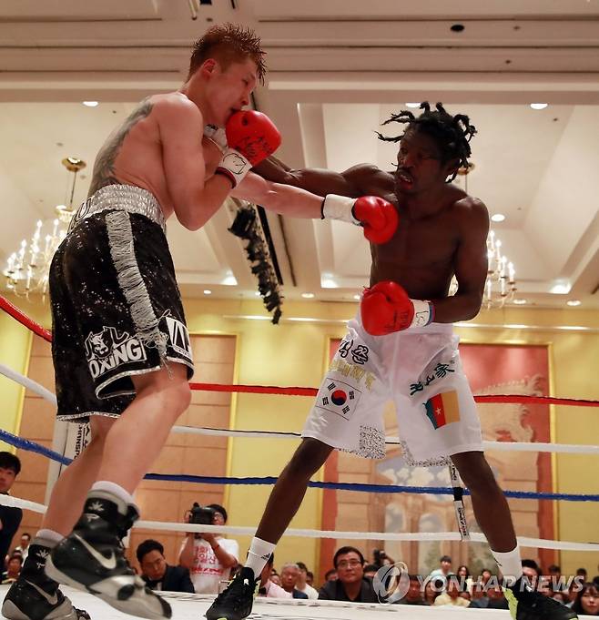 (서울=연합뉴스) 홍해인 기자 = 카메룬 출신의 ‘난민 복서’이흑산(오른쪽)이 29일 오후 서울 홍은동 그랜드 힐튼호텔에서 열린 WBA 아시아 웰터급 타이틀매치에서 정마루에게 주먹을 날리고 있다. 2018.7.29