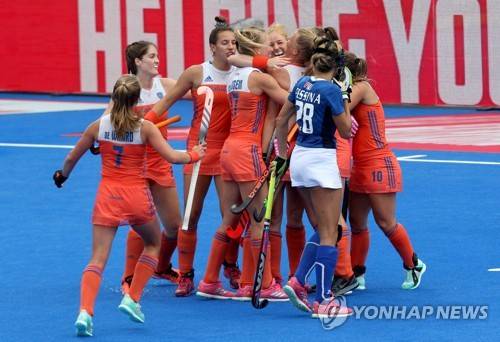 epa06917545 Dutch players celebrate a goal during the women's Field Hockey World Cup match between the Netherlands and Italy at the Lee Valley Hockey Centre, Queen Elizabeth Olympic Park in London, Britain, 29 July 2018. EPA/SEAN DEMPSEY