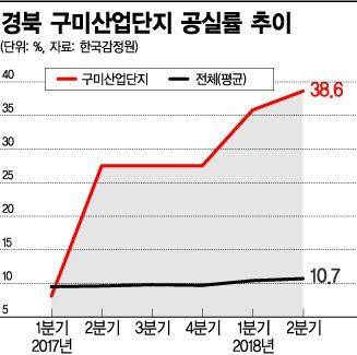 30일 한국감정원에 따르면 올해 2ㆍ4분기 구미산업단지 중대형 상가(일반 3층 이상이거나 전체면적 330㎡ 초과) 공실률은 38.6%다.