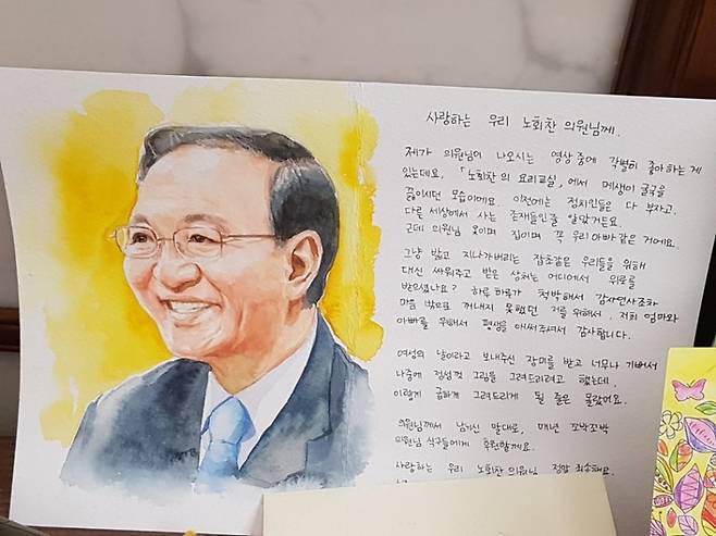제가 의원님이 나오시는 영상 중에 각별히 좋아하는 게 있는데요, ‘노회찬의 요리교실’에서 매생이굴국을 끓이시던 모습이에요. 이전에는 정치인들은 다 부자고, 다른 세상에서 사는 존재들인 줄 알았거든요. 근데 의원님은 옷이며, 집이며 꼭 우리 아빠 같은 거예요.