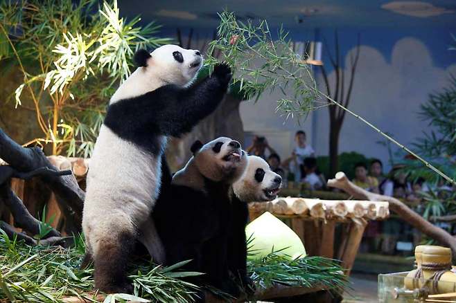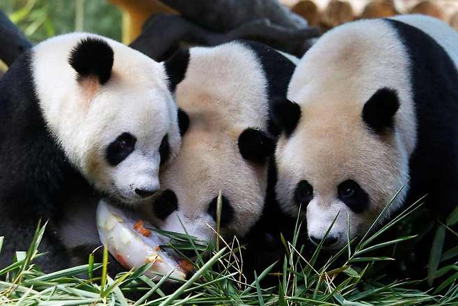 지난 29일 로이터 통신 등 외신은 현존하는 유일한 세쌍둥이 판다가 동물원 관계자들의 축복 속에 4번째 생일상을 받았다고 보도했다. 4년 전에 비해 몰라보게 쑥 자란 판다들의 이름은 각각 암컷인 ‘멍멍’, 수컷인 ‘솨이솨이’와 ‘쿠쿠’.