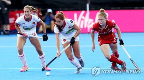 epa06919368 Spain's Begona Garcia (C) and Maialen Garcia (L) in action against Belgium's Emma Puvrez (R) during the women's Field Hockey World Cup match between Belgium and Spain at the Lee Valley Hockey Centre, Queen Elizabeth Olympic Park in London, Britain, 30 July 2018. EPA/SEAN DEMPSEY
