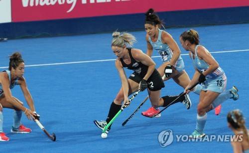epa06919483 New Zealand's Anita McLaren (C) in action during the women's Field Hockey World Cup match between Argentina and New Zealand at the Lee Valley Hockey Centre, Queen Elizabeth Olympic Park in London, Britain, 30 July 2018. EPA/SEAN DEMPSEY