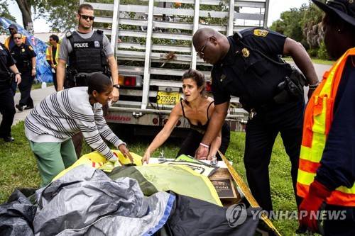 Zulema Ramos, from left, and Jessica Filipe gather their belongings after authorities forced them and other protesters out of their camp at the Department of Homeland Security and U.S. Immigration and Customs Enforcement office in Tampa, Fla., on Monday, July 30, 2018. (Bronte Wittpenn/Tampa Bay Times via AP)