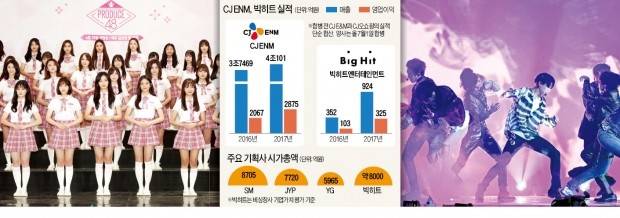 국내 최대 종합미디어기업 CJ ENM이 대형 기획사 빅히트엔터테인먼트와 손잡고 엔터테인먼트회사를 설립한다. ‘프로듀스101’ ‘슈퍼스타K’ 등의 오디션 프로그램을 성공시킨 CJ ENM의 콘텐츠 제작 능력과 ‘월드 스타’ 방탄소년단을 탄생시킨 빅히트의 스타 육성 시스템을 결합해 차세대 한류를 이끌 글로벌 아이돌그룹을 키우기 위해서다.