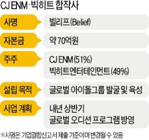 이번 합작은 CJ오쇼핑이 CJ E&M을 흡수·합병해 7월 새롭게 출범한 CJ ENM이 글로벌 콘텐츠 회사로 도약하기 위한 첫 번째 프로젝트다. 빅히트는 CJ와 협업을 통해 SM, JYP, YG로 형성된 엔터테인먼트업계 ‘빅3’ 구도의 지각 변동을 노리고 있다. 합작사는 한국 미국 중국 일본 등 세계에서 진행될 오디션 프로그램을 기획·제작해 글로벌 아이돌그룹 발굴 및 육성에 나설 계획이다.