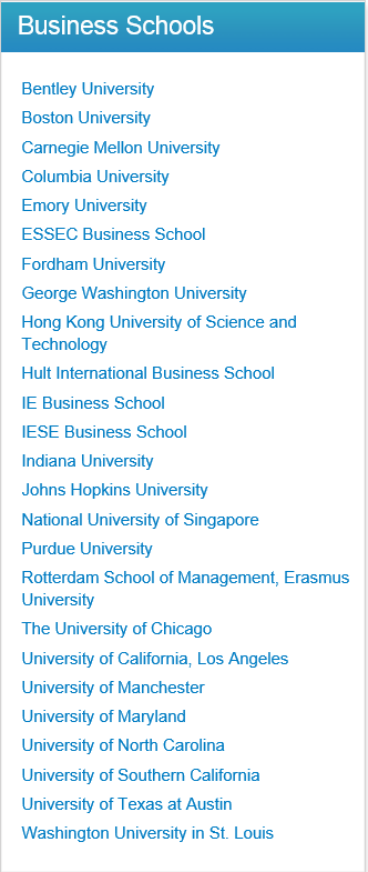 Chicago Booth, Columbia, Carnegie Mellon Tepper, Emory Goizueta, Washington in St.Louis Olin. USC Marshall, UNC Chapel Hill Kenan-Flagler, Texas Austin McComb, Indiana Kelly등 미국 유수의 비즈니스 스쿨을 비롯하여 INSEAD, IE와 같은 유럽 명문 학교들도 한 자리에서 만나볼 수 있다.