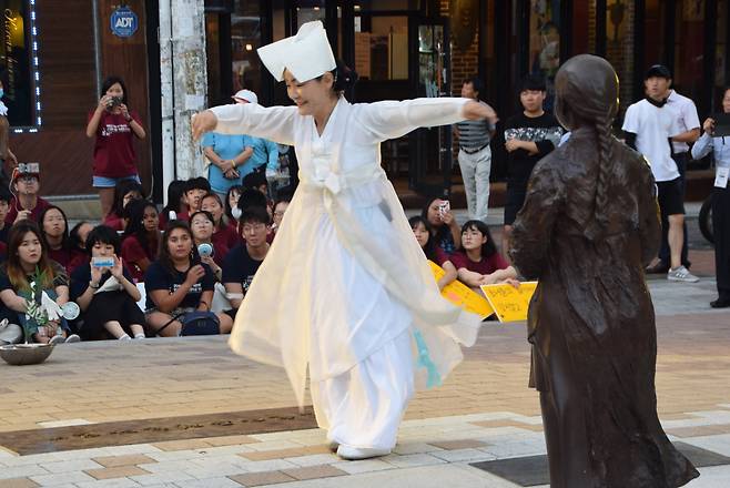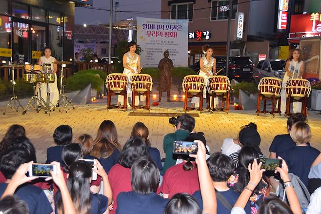 | ▲ '일본군 위안부 역사의 과제를 위한 국제청소년대회'에 참석한 5개 나라 고등학생과 대학생들이 8월 1일 저녁 창원마산 오동동 인권자주평화다짐비 앞에서 "일본군위안부 피해자 기림일 기념 추모문화제"를 열었다. 장순향 교수의 공연. |