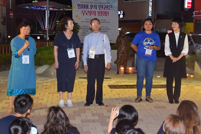 참가자들은 "할머니의 인권은 우리의 평화"라는 제목으로 '일본군 위안부 피해자 기림일 기념 추모문화제'를 열었다. 일본군위안부 피해자기림일은 8월 14일로, 우리 정부는 올해부터 기념일로 지정했다.
