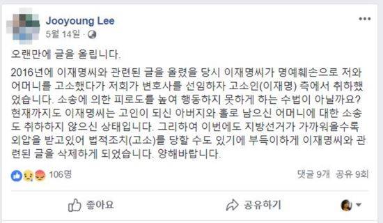이주영씨는 지난 5월 14일 자신의 페이스북에 이재명 경기도지사에 대한 호소글을 삭제한 이유에 대해 설명했다. 이재명 도지사는 당시 총선을 앞두고 있는 상황에서 형수 욕설 파문이 불거졌었다. 이에 이 도지사는 형수가 어머니를 폭행해 욕설을 했다고 주장했었다.