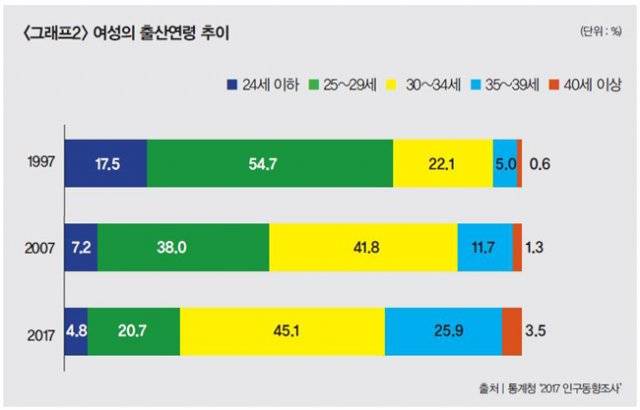 통계청이 발표한 최근 통계를 과거와 비교해보면 한국에서 늦은 출산이 얼마나 급격하게 증가했는지 알 수 있다. 2017년 인구동향조사 결과 첫아이 출산연령은 1997년 26.9세에서 2017년 31.6세로 빠르게 증가했다. 그 결과 1997년 전체 산모의 5%에 불과하던 30대 후반(35~39세) 산모가 2017년 25.9%로 크게 늘어났다. 당시 0.6%에 불과하던 40대 이상 산모도 3.5%로 약 6배나 증가했다. 30대 초반(30~34세) 산모까지 포함하면 30대 이상 산모가 열 중 셋(27.7%)에서 일곱(74.5%)이 됐다.(그래프2 참조)