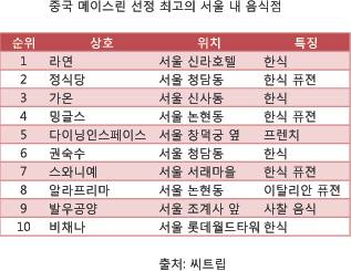 이런 인기는 다양한 결과를 낳고 있다. 한국인들은 잘 모르지만 중국의 대표적인 레스토랑 평가업체인 메이스린(美食林)이 지난해부터 국내 식당에 점수를 매기고 이를 온라인에서 소개하고 있다. '중국판 미쉐린'을 표방하는 이 업체도 전문적인 음식 평가위원을 두고 뛰어난 식당에게 하나에서 최고 셋까지 별 등급을 준다. 또 해당 음식점에는 메이스린 등급 식당이라는 스티커를 붙이도록 해준다.