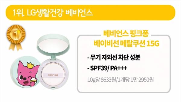 1위를 차지한 LG생활건강의 '베비언스 핑크퐁 베이비 선 메탈쿠션'의 자외선 차단지수는 39입니다.