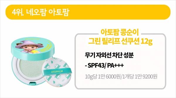 마지막으로 네오팜 '아토팜 콩순이 그린 릴리프 선쿠션' 제품은 10g당 1만 6000원으로 가장 비쌌고, 자외선차단지수는 43이었습니다.