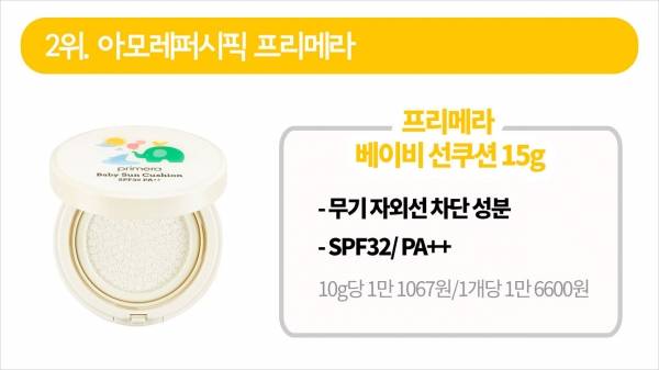 2위는 10g당 가격이 1만 1067원인 아모레퍼시픽의 '프리메라 베이비 선쿠션'이 차지했는데요. 자외선차단지수는 32입니다.
