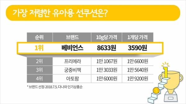 그 결과, 베비언스 제품이 10g당 8633원으로 가장 저렴했습니다. 하지만 아이들의 피부에 직접 닿는 제품을 구입할 때, 가격만 따져볼 순 없죠.