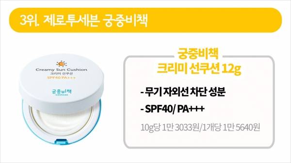 다음으로 저렴한 선쿠션 3위는 제로투세븐의 '궁중비책 크리미 선쿠션'이 10g당 1만 3033원으로 조사됐는데요. 자외선차단지수는 40입니다.