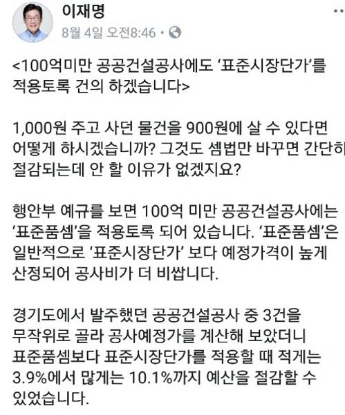 이 지사는 앞서 지난 4일 페이스북에 글을 올려 "경기도에서 발주했던 공공건설공사 중 3건을 무작위로 골라 공사예정가를 계산해 보았더니 표준품셈 대신 표준시장단가를 적용할 때 적게는 3.9%에서 많게는 10.1%까지 예산을 절감할 수 있었다"고 밝혔다.