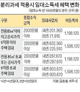 임대소득이 연 1956만원일 때 공시가격 6억원 이하의 중소형 주택을 8년 이상 장기임대(준공공임대) 주택으로 등록하면 분리과세 대상이 돼 총 7만1910원(지방소득세 포함)의 임대소득세가 부과된다.