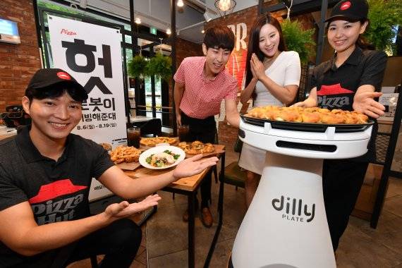 한국피자헛이 배달의민족과 함꼐 외식업계 최초로 서빙 로봇 '딜리 플레이트'를 서울 목동동로 피자헛 목동중앙점 패스트 캐주얼 다이닝 레스토랑에 도입했다. 8일 오전 피자헛 직원과 홍보도우미들이 서빙 로봇을 선보이고 있다. 이 서빙 로봇은 6일부터 19일까지 시범 운영할 예정이다. 사진=서동일 기자