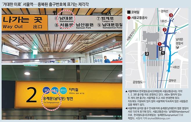 이렇다 보니 서울역에는 1, 2, 3번 출구가 2개씩 있다. 고속철도(KTX) 등이 오가는 코레일의 지상 서울역, 지하철이 있는 서울교통공사의 출구 번호가 중복 지정됐기 때문이다. 한 예로 ‘서울역 3번 출구’가 코레일 것은 서부역에, 서울교통공사 것은 그곳에서 직선으로 480m 떨어진 세종대로에 따로 있다. 이를 별도로 설명한 안내판이 없기 때문에 코레일 서울역 2층 대합실에서 ‘지하철 3번 출구’를 가려는 사람이 ‘3’자만 보고 따라가다 ‘코레일 3번 출구’로 가면 엉뚱한 곳으로 나가게 된다.