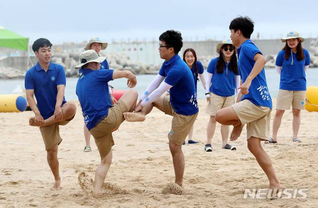 【고성(강원)=뉴시스】이영환 기자 = '제10회 대한민국 해양영토 대장정'에 참가한 대원들이 9일 오후 강원도 고성군 봉수대해수욕장에서 닭싸움을 즐기고 있다.