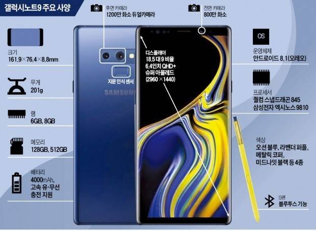 삼성전자는 갤럭시노트9이 저장용량과 배터리, 프로세서 등에서 현존하는 스마트폰 가운데 최고 수준의 스펙을 갖췄다고 밝혔다. 결함탐지 기능처럼 사용자들이 편리하게 쓸 수 있는 기능도 많았다.