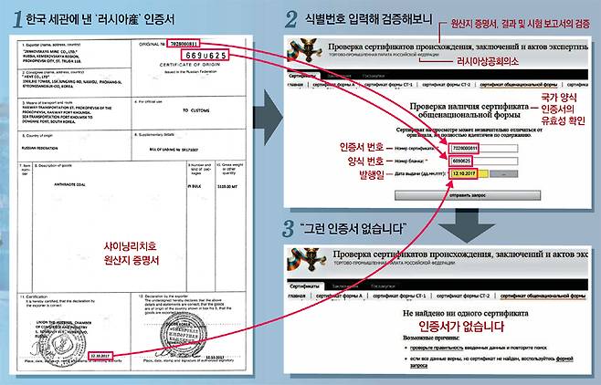 | 샤이닝리치호, 가짜 원산지 증명서로 석탄 국내반입 지난해 10월 북한산으로 추정되는 석탄을 국내에 반입한 샤이닝리치호가 국내 세관에 제출한 원산지 증명서(①번 사진). 증명서 발급기관인 러시아 상공회의소 홈페이지의 원산지 검색 시스템에 해당 인증서 번호 등을 입력했지만 ‘인증서가 없다’는 결과가 나왔다(②, ③번 사진). |