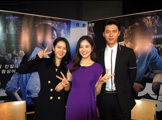사진에는 SBS 영화정보프로그램 '접속! 무비월드' 인터뷰에 나선 장예원과 영화 '협상'의 손예진, 현빈의 다정한 모습이 담겨있다.