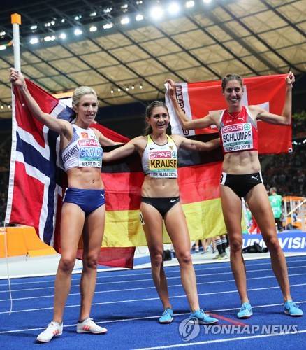 epa06946637 Gesa-Felicitas Krause (C) of Germany celebrates after winning the women's 3,000m Steeplechase final at the Athletics 2018 European Championships, Berlin, Germany, 12 August 2018. Krause won ahead of second placed Fabienne Schlumpf (R) of Switzerland and third placed Karoline Bjerkeli Grovdal (L) of Norway. EPA/SRDJAN SUKI