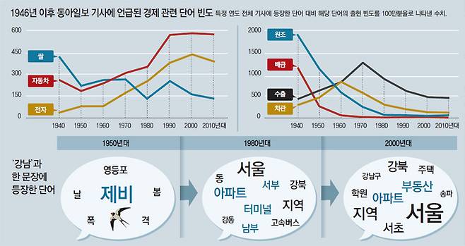 1980년대부터 '전자'가 '쌀' 추월.. 강남 연관어 '제비'→'아파트'