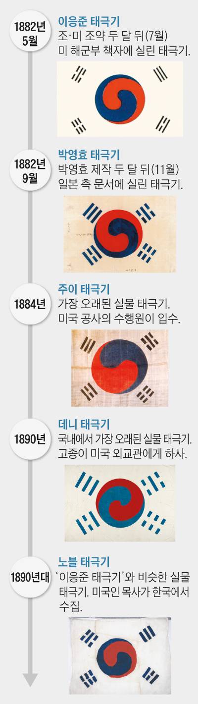 현존하는 가장 오래된 실물 태극기는 1884년 미국 공사 수행원이던 주이가 입수한 '주이 태극기'다. 국내에서 가장 오래된 실물 태극기는 '데니 태극기'다. 고종이 1890년 미국 외교관 오언 데니에게 하사한 것으로 국립중앙박물관에서 19일까지 전시 중이다.