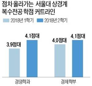 서울대 경제학부도 사정은 마찬가지다. 2학기 복수전공 학점 커트라인이 역대 최고인 4.1점으로 확인됐다. 경영·경제학부 진입이 어려워지자 경제학사를 수여하는 농경제사회학부나 일부 기업에서 상경계로 인정하는 소비자학과 등을 ‘차선책’으로 선택하는 사례도 늘었다.