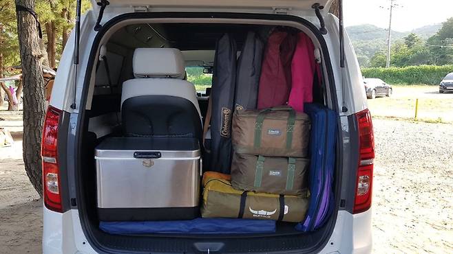 시승을 위해 두 가족이 모였다. 다섯 명의 인원과 각자의 짐을 스타렉스 리무진 한 차에 싣고 캠핑을 떠날 참이었다. 캠핑을 위한 짐은 크게 이너 텐트 2개, 의자 5개, 침낭 4개, 아이스박스 1개, 테이블 1개 그리고 각종 물품을 담은 대형 가방 두어개 정도로 꾸렸다. 리무진이라 트렁크가 크진 않았지만 짐을 넣는 건 어렵지 않았다. 차체가 높다보니 캠핑 의자 5개가 세로로 들어가는 진풍경을 연출했다. 본래 승용차 트렁크에선 무조건 가로로밖에 넣을 수 없는 크기여서 사뭇 놀라웠다. 트렁크 용량이 모자라 남은 짐과 가방 등은 시트 위에 쌓았다. 시트는 앞으로 완전히 폴딩되는 방식이 아니어서 그대로 세운 채 위에 짐을 올렸다. 그리고 좌우 좌석 사이에 남는 통로 곳곳에도 짐을 놨다. 통로가 널찍해 나름 수납 공간으로 유용하게 활용했다. 그렇게 두 가족의 캠핑 장비는 무리 없이 모두 실렸다.