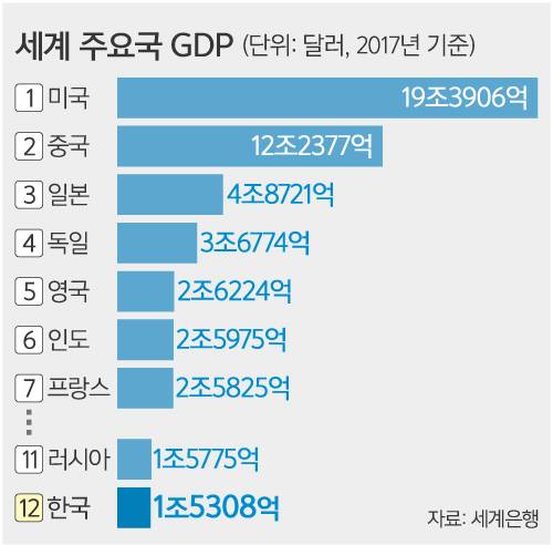16일 세계은행(WB)에 따르면 지난해 한국의 명목 GDP는 1조5308억달러를 기록했다. 전 세계 순위는 12위다. 2005년 10위까지 상승한 것이 최고 순위다. 이후 순위가 하락하다가 2015, 2016년 11위로 올라섰으나 지난해 다시 한 계단 하락한 것이다. 대표적인 산유국 러시아가 유가상승 효과로 한국을 밀어내고 1조5775억달러를 기록하며 11위를 차지했다. 지난해 GDP 순위 1위는 19조3906억달러를 달성한 미국이었다. 이어 중국(12조2377억달러), 일본(4조8721억달러)순이었다.
