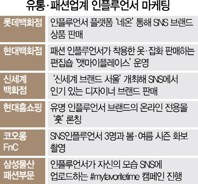 현대백화점은 인플루언서가 착용한 상품을 오프라인 매장에서 선보이고 있다. 현대백화점의 컨템프로리 브랜드 편집숍 ‘앳마이플레이스’에는 인스타그램 기반의 패션 큐레이션 서비스 ‘하트잇’이 론칭한 ‘잇프로젝트’ 상품을 오프라인 매장 최초로 입점시켰다. 하트잇은 인스타그램 패션 인플루언서가 착용한 옷이나 잡화를 소개하는 서비스다. 현대백화점 관계자는 “SNS 브랜드의 디자이너들은 수천에서 수만명의 팔로어를 가진 인플루언서”라며 “이들의 패션스타일을 따라 하고 싶어하는 젊은 고객들의 니즈를 충족시키기 위해 SNS 브랜드 중심의 편집숍을 기획했다”고 설명했다.