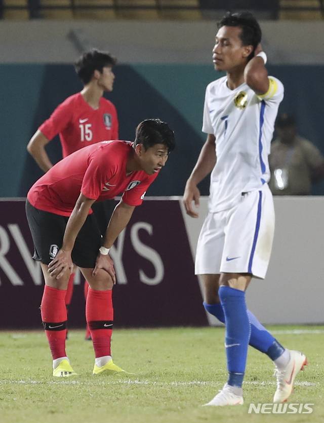 【반둥(인도네시아)=뉴시스】최진석 기자 = 17일(현지시각) 인도네시아 반둥 시 잘락 하루팟 스타디움에서 열린 2018 자카르타·팔렘방 아시안게임 남자 축구 조별리그 E조 2차전 대한민국과 말레이시아의 경기에서 1대2로 패배한 대한민국 손흥민이 아쉬워하고 있다. 2018.08.17.