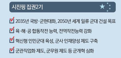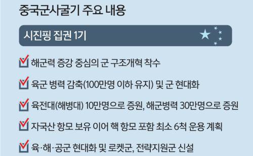 향후 15년내 항모 6척 운영/이지스함·핵잠등 속속 건조/전체 해군 함정 100척 육박/2000년 이후 함정 건조능력/韓·印·日 합친 것보다 많아/4년간 만든 t수로만 佛 추월 근해 넘어 원양작전 능력 강화/진주목걸이 구상, 인도와 충돌/美 태평양 방어선 무력화 시도/전문가 "하드웨어는 갖췄지만/운용하는 소프트웨어 떨어져/통합 작전능력, 美軍에 못미쳐"