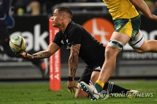 epa06955771 Aaron Smith of the All Blacks celebrates his try during the first Bledisloe Cup match between Australia and New Zealand at ANZ Stadium in Sydney, Australia, 18 August 2018. EPA/DEAN LEWINS AUSTRALIA AND NEW ZEALAND OUT